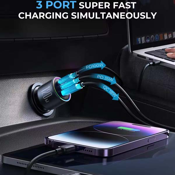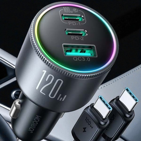 Öruggt og öflugt hraðhleðslutæki sem tengist sígarettukveikjaranum í bílnum. Tækið er með þremur USB tengjum sem hægt er að nota til að hlaða þrjú tæki samtímis. Hraðhleðslutækið er með einu USB-A tengi og tveimur USB-C tengjum. Það fylgir með 1,2 metra snúra (100W) USB-C í USB-C. Það er t.d. hægt að hlaða Macbook, HP, Lenovo, Chromebook, ferðavélar, Ipad, iPhone, Samsung, Motorola og Google farsíma og margt fleira með hraðhleðslutækinu.