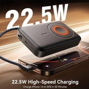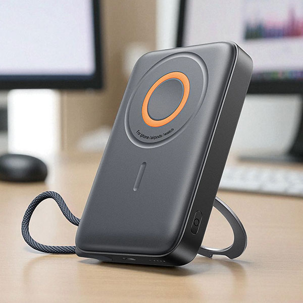 Fjölnota 22,5W MagSafe 10.000mAh hleðslubanki sem hleðslur Apple tækin þín þráðlaust þegar á þarf að halda t.d. í vinnunni, í bílnum, í ferðalaginu eða erlendis. Hleðslubankinn er með MagSafe og festir sig við iPhone, Apple Watch og Airpods og hleður þráðlaust. Á meðan þú hleður símann getur þú notað hleðslubankann sem símahaldara því hann er með innbyggðum standi.